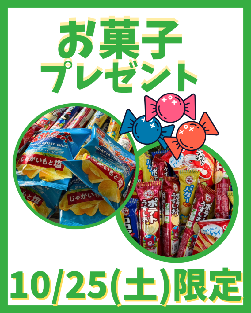 2025.10.23 お菓子プレゼント🎁 10/26(日)13時から予定していた「お菓子のばらまき」は悪天候が予想されるため、11月3日(月)13時からに延期となりました💦申し訳ございません。 でも!その代わりに!!! 10/25(土)にツリートップアドベンチャーを体験していただいた方に✨お菓子をプレゼント✨ 無くなり次第終了なのでお早めにお越しください🚗 ご来場お待ちしております。